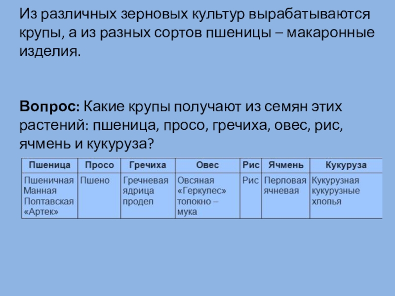 Из различных зерновых культур вырабатываются крупы, а из разных сортов пшеницы