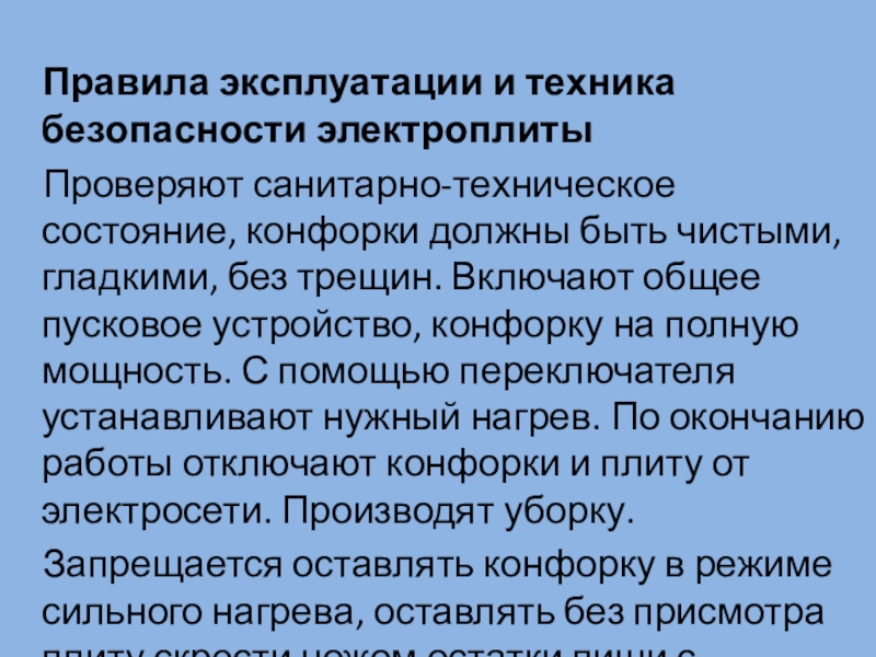 чистыми, гладкими, без трещин. Включают общее пусковое устройство, конфорку на полную мощность. С помощью переключателя устанавливают нужный нагрев. По окончанию работы отключают конфорки и плиту от электросети. Производят уборку.