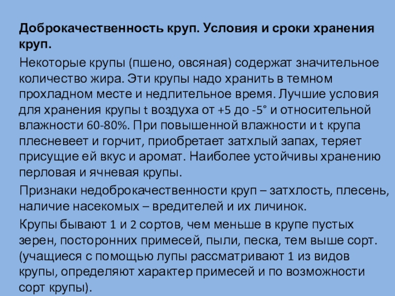значительное количество жира. Эти крупы надо хранить в темном прохладном месте и недлительное время. Лучшие условия для хранения крупы t воздуха от +5 до -5° и относительной влажности 60-80%. При повышенной влажности и t крупа плесневеет и горчит, приобретает затхлый запах, теряет присущие ей вкус и аромат. Наиболее устойчивы хранению перловая и ячневая крупы.