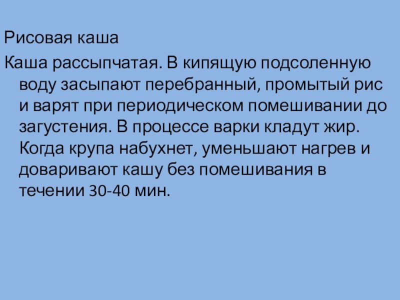 Каша рассыпчатая. В кипящую подсоленную воду засыпают перебранный, промытый рис