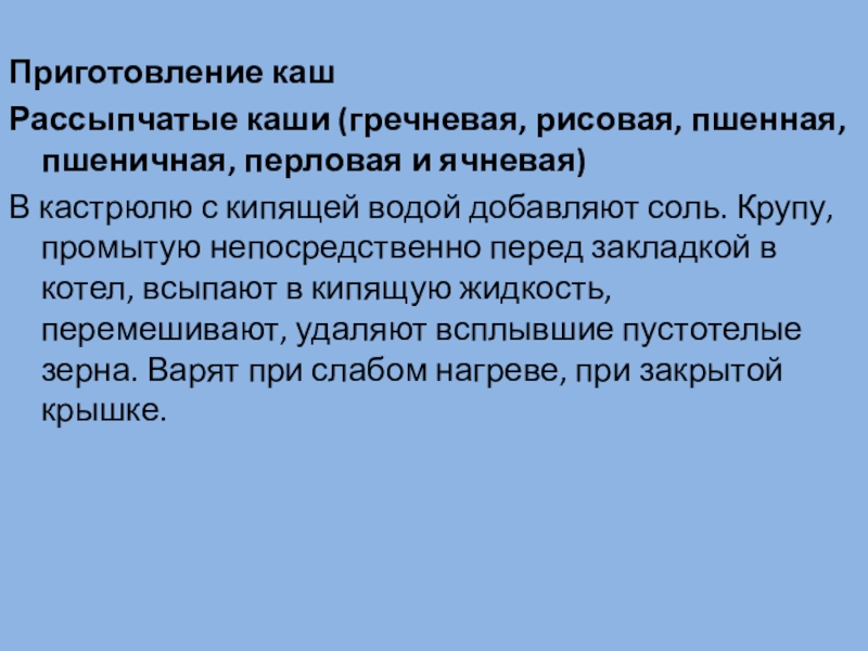 распределения по каше, рассыпчатости, улучшение вкуса. Как только при нагревании она набухнет и поглотит воду, перемешивание прекращают, поверхность каши разравнивают, котел накрывают крышкой и доваривают (упаривают) кашу, уменьшив нагрев, но при температуре не ниже 90° С на краю плиты или в жарочном шкафу. Мешать кашу в процессе варки не следует. Если кашу варят из поджаренной крупы, то воды берут на 5-6% больше, чем для каш из сырой крупы.