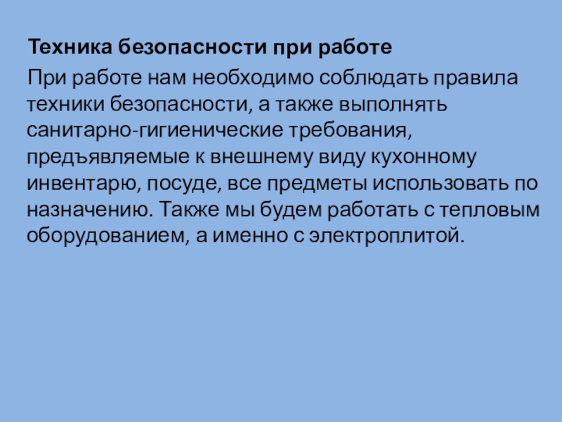 а также выполнять санитарно-гигиенические требования, предъявляемые к внешнему виду кухонному инвентарю, посуде, все предметы использовать по назначению. Также мы будем работать с тепловым оборудованием, а именно с электроплитой.