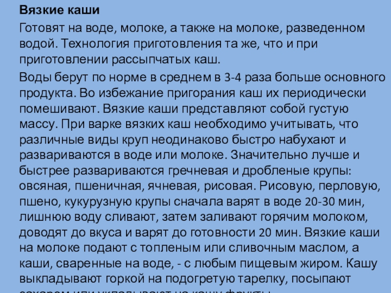 Воды берут по норме в среднем в 3-4 раза больше основного продукта. Во избежание пригорания каш их периодически помешивают. Вязкие каши представляют собой густую массу. При варке вязких каш необходимо учитывать, что различные виды круп неодинаково быстро набухают и развариваются в воде или молоке. Значительно лучше и быстрее развариваются гречневая и дробленые крупы: овсяная, пшеничная, ячневая, рисовая. Рисовую, перловую, пшено, кукурузную крупы сначала варят в воде 20-30 мин, лишнюю воду сливают, затем заливают горячим молоком, доводят до вкуса и варят до готовности 20 мин. Вязкие каши на молоке подают с топленым или сливочным маслом, а каши, сваренные на воде, - с любым пищевым жиром. Кашу выкладывают горкой на подогретую тарелку, посыпают сахаром или укладывают на кашу фрукты.