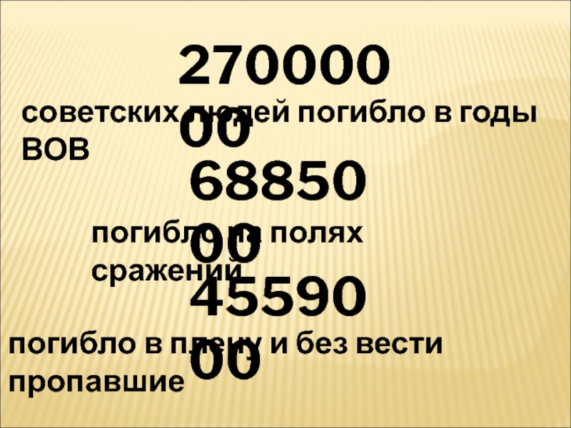 27000000советских людей погибло в годы ВОВ 6885000погибло на полях сражений4559000погибло в плену и без вести пропавшие