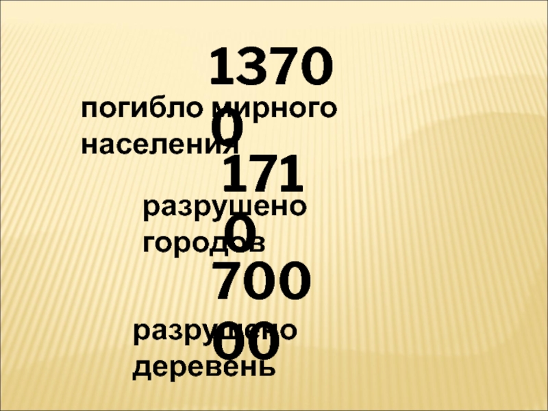 13700погибло мирного населения 1710разрушено городов70000разрушено деревень