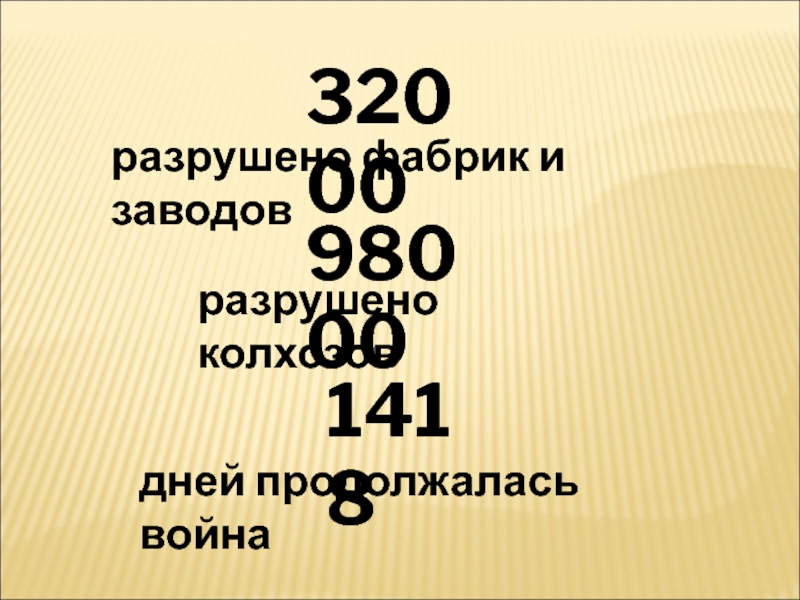 32000разрушено фабрик и заводов98000разрушено колхозов1418дней продолжалась война