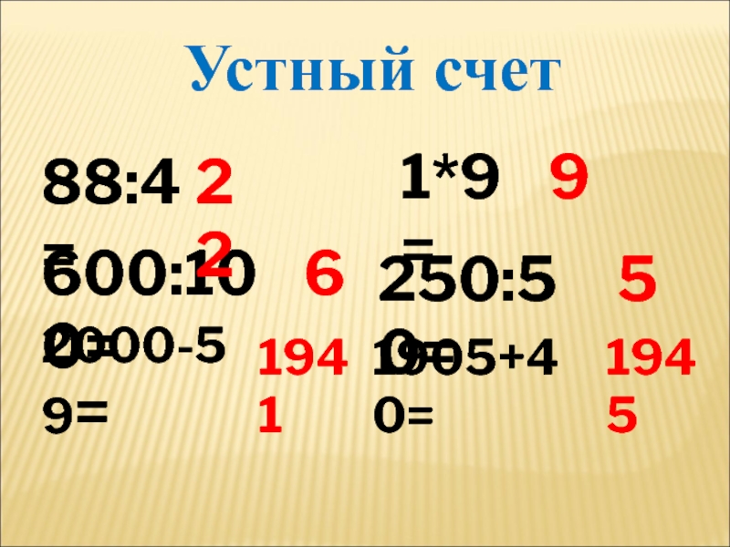 600:100=62000-59=19411905+40=1945250:50=588:4=221*9=9Устный счет