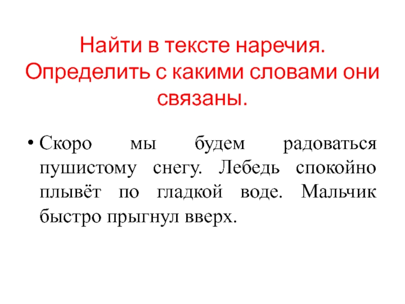 Найти в тексте наречия. Определить с какими словами они связаны.Скоро мы будем радоваться пушистому снегу. Лебедь спокойно