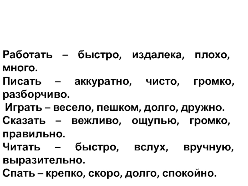 Работать – быстро, издалека, плохо, много. Писать – аккуратно, чисто, громко, разборчиво. Играть – весело, пешком, долго,