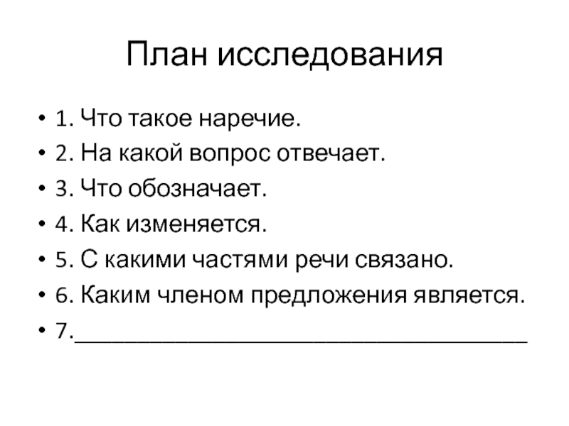 План исследования1. Что такое наречие.2. На какой вопрос отвечает.3. Что обозначает.4. Как изменяется.5. С какими частями речи связано.6. Каким членом предложения является.7.____________________________________
