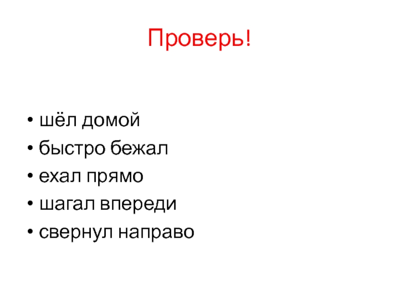 Проверь!шёл домойбыстро бежалехал прямошагал впередисвернул направо
