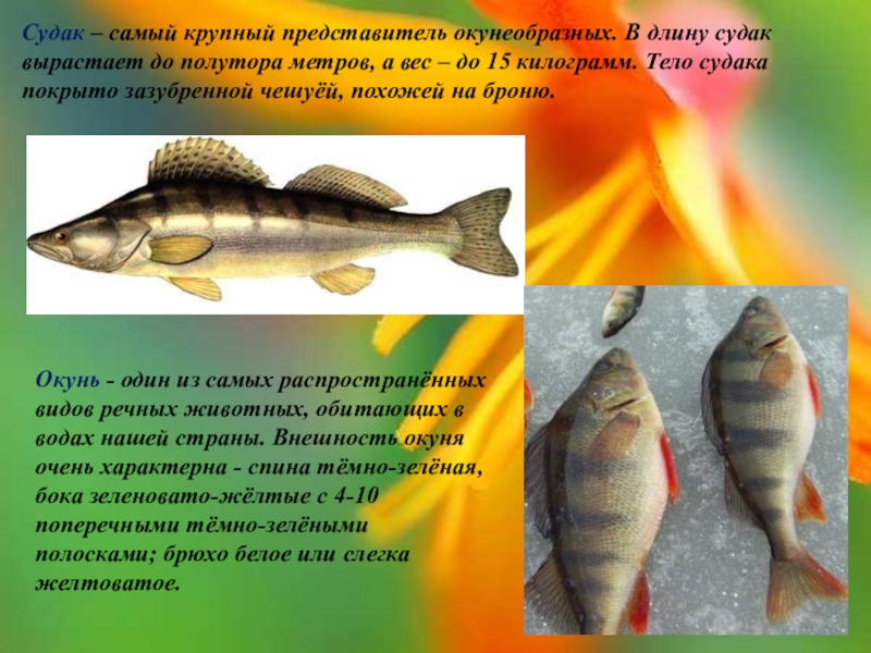 Окунь - один из самых распространённых видов речных животных, обитающих в водах нашей страны. Внешность окуня очень характерна - спина тёмно-зелёная, бока зеленовато-жёлтые с 4-10 поперечными тёмно-зелёными полосками; брюхо белое или слегка желтоватое.