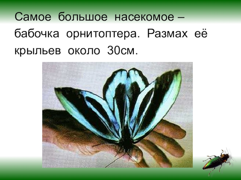 Самое большое насекомое – бабочка орнитоптера. Размах её крыльев около 30см.