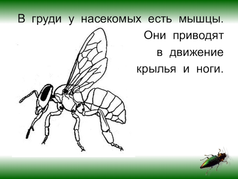 В груди у насекомых есть мышцы.Они приводят в движение крылья и ноги.