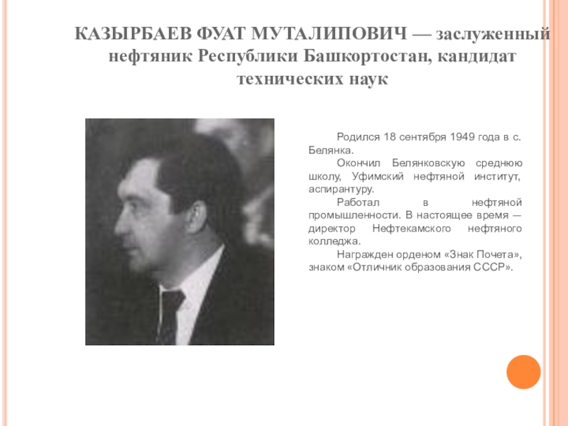 КАЗЫРБАЕВ ФУАТ МУТАЛИПОВИЧ — заслуженный нефтяник Республики Башкортостан, кандидат технических наук