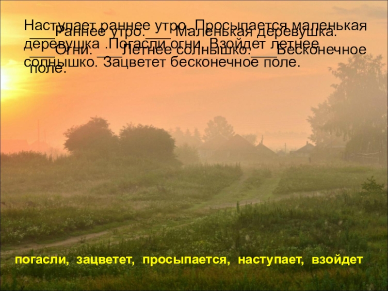 Наступает раннее утро. Просыпается маленькая деревушка .Погасли огни. Взойдет летнее солнышко. Зацветет бесконечное поле.
