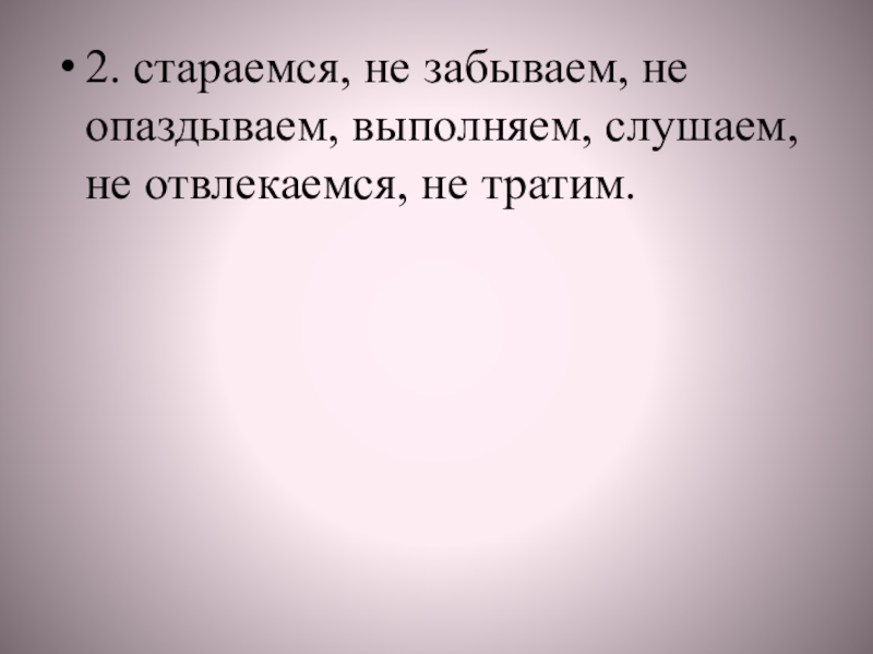 2. стараемся, не забываем, не опаздываем, выполняем, слушаем, не отвлекаемся, не тратим.