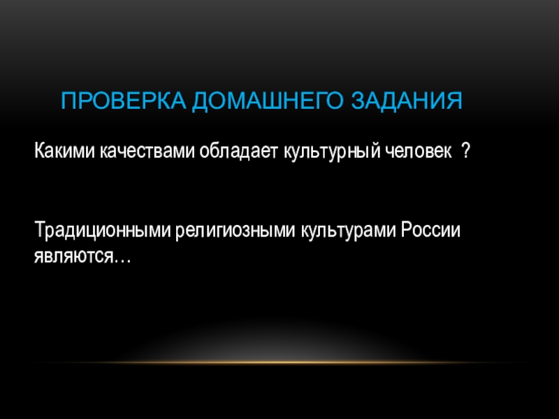 Проверка домашнего заданияКакими качествами обладает культурный человек ?Традиционными религиозными культурами России являются…