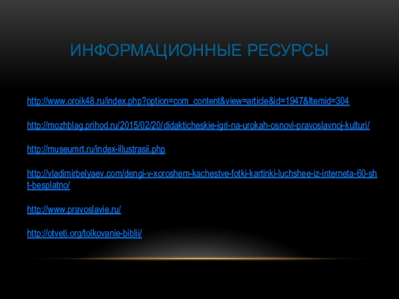 Информационные ресурсы  http://www.oroik48.ru/index.php?option=com_content&view=article&id=1947&Itemid=304http://mozhblag.prihod.ru/2015/02/20/didakticheskie-igri-na-urokah-osnovi-pravoslavnoj-kulturi/http://museumrt.ru/index-illustrasii.phphttp://vladimirbelyaev.com/dengi-v-xoroshem-kachestve-fotki-kartinki-luchshee-iz-interneta-60-sht-besplatno/http://www.pravoslavie.ru/http://otveti.org/tolkovanie-biblii/