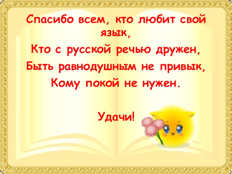 Спасибо всем, кто любит свой язык,Кто с русской речью дружен,Быть равнодушным не привык,Кому покой не нужен.Удачи!