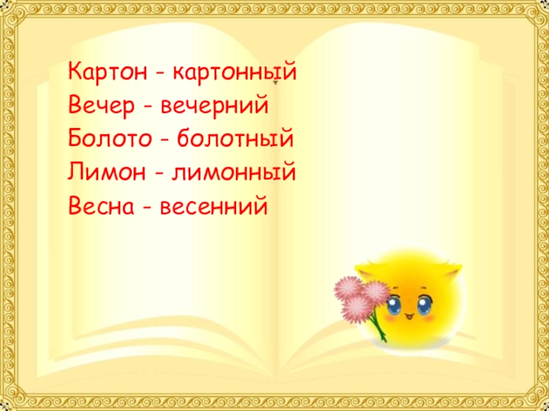 Картон - картонныйВечер - вечернийБолото - болотныйЛимон - лимонныйВесна - весенний