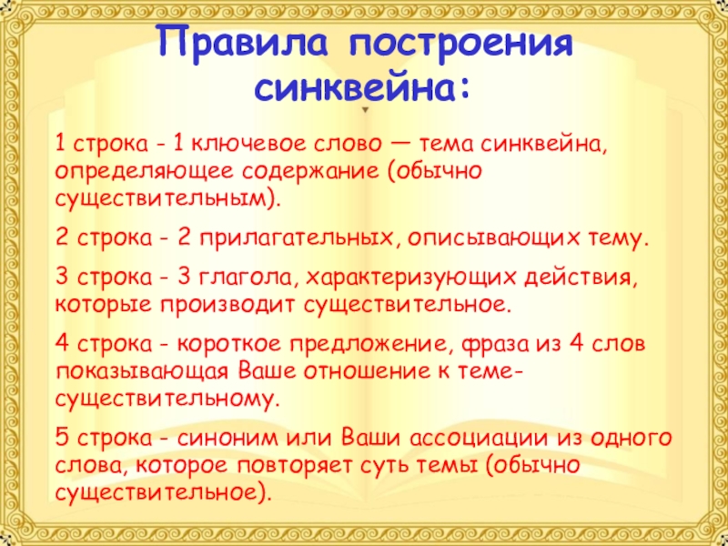 Правила построения синквейна: 1 строка - 1 ключевое слово — тема синквейна, определяющее содержание (обычно существительным).2 строка