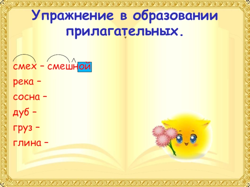 Упражнение в образовании прилагательных.смех – смешнойрека – сосна – дуб – груз – глина –