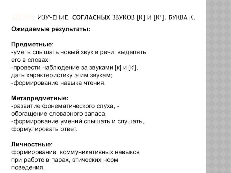 Слайд 3ЦЕЛЬ: ИЗУЧЕНИЕ СОГЛАСНЫХ ЗВУКОВ [К] И [К’]. БУКВА К.