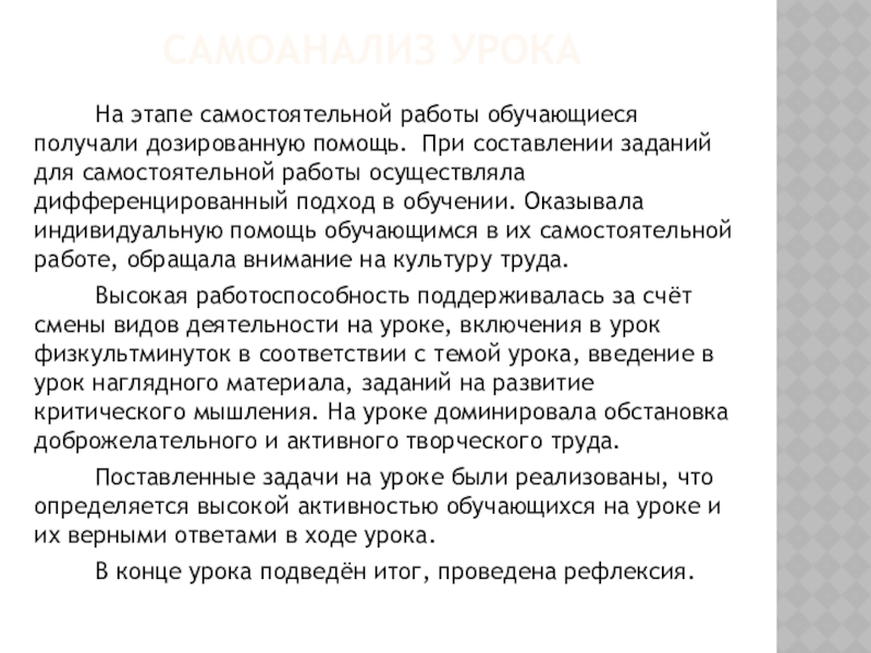 заданий для самостоятельной работы осуществляла дифференцированный подход в обучении. Оказывала индивидуальную помощь обучающимся в их самостоятельной работе, обращала внимание на культуру труда.