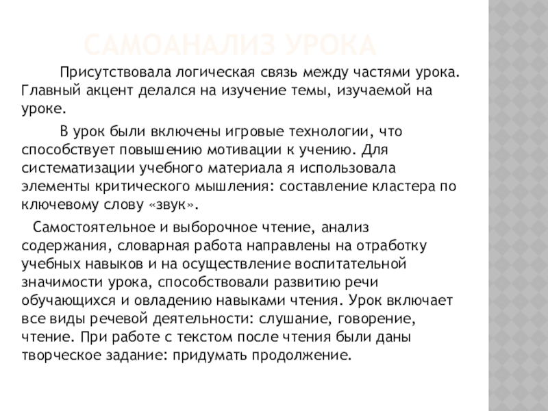 Самостоятельное и выборочное чтение, анализ содержания, словарная работа направлены на отработку учебных навыков и на осуществление воспитательной значимости урока, способствовали развитию речи обучающихся и овладению навыками чтения. Урок включает все виды речевой деятельности: слушание, говорение, чтение. При работе с текстом после чтения были даны творческое задание: придумать продолжение.