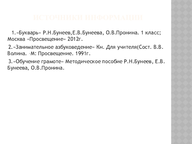 1.»Букварь» Р.Н.Бунеев,Е.В.Бунеева, О.В.Пронина. 1 класс; Москва «Просвещение» 2012г.