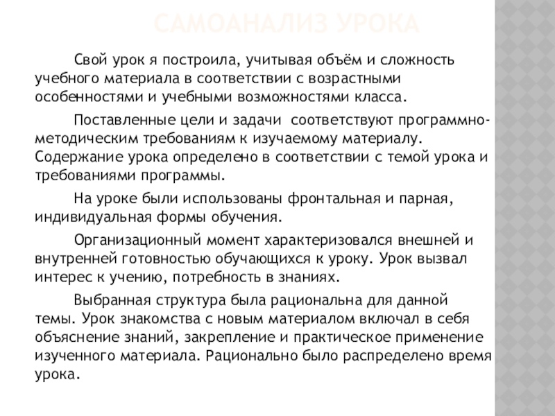 Выбранная структура была рациональна для данной темы. Урок знакомства с новым материалом включал в себя объяснение знаний, закрепление и практическое применение изученного материала. Рационально было распределено время урока.