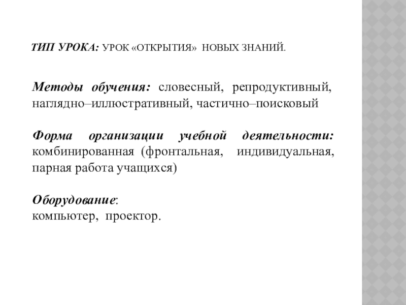 Форма организации учебной деятельности: комбинированная (фронтальная, индивидуальная, парная работа учащихся)