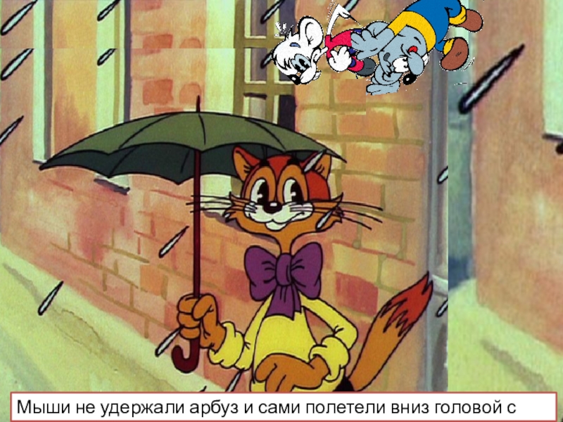 Слайд 40Мыши не удержали арбуз и сами полетели вниз головой с крыши