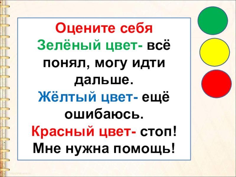 Оцените себяЗелёный цвет- всё понял, могу идти дальше.Жёлтый цвет- ещё ошибаюсь.Красный цвет- стоп! Мне нужна помощь!