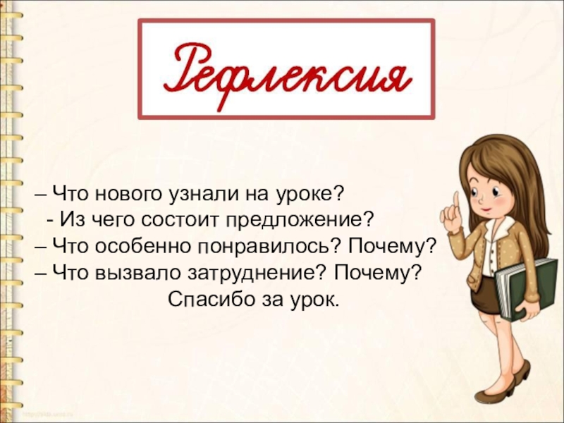 – Что нового узнали на уроке? - Из чего состоит предложение?– Что особенно понравилось? Почему?– Что вызвало