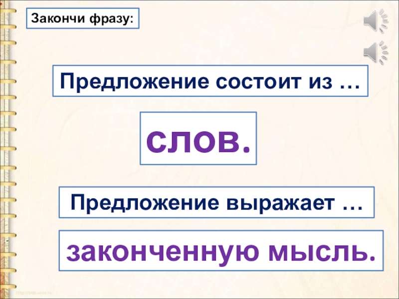 Закончи фразу:Предложение состоит из …Предложение выражает …слов.законченную мысль.