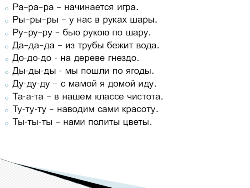 Ра–ра–ра – начинается игра.Ры–ры–ры – у нас в руках шары.Ру–ру–ру – бью рукою по шару.Да–да–да – из