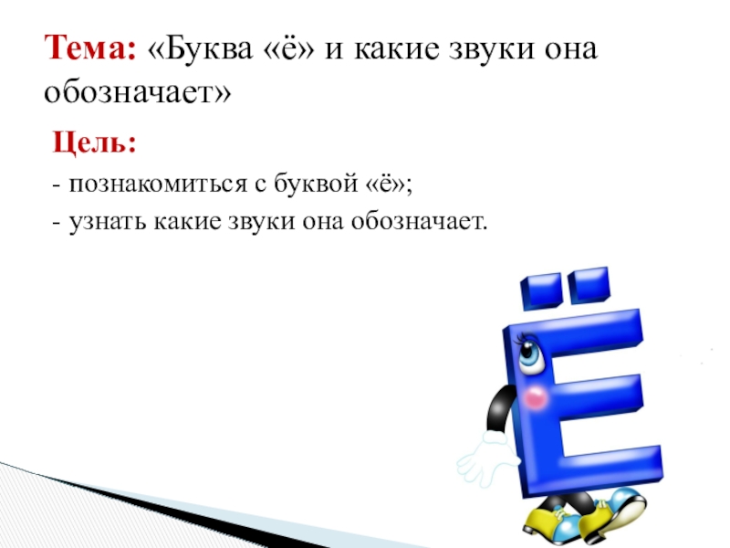 Цель:- познакомиться с буквой «ё»;- узнать какие звуки она обозначает.Тема: «Буква «ё» и какие звуки она обозначает»