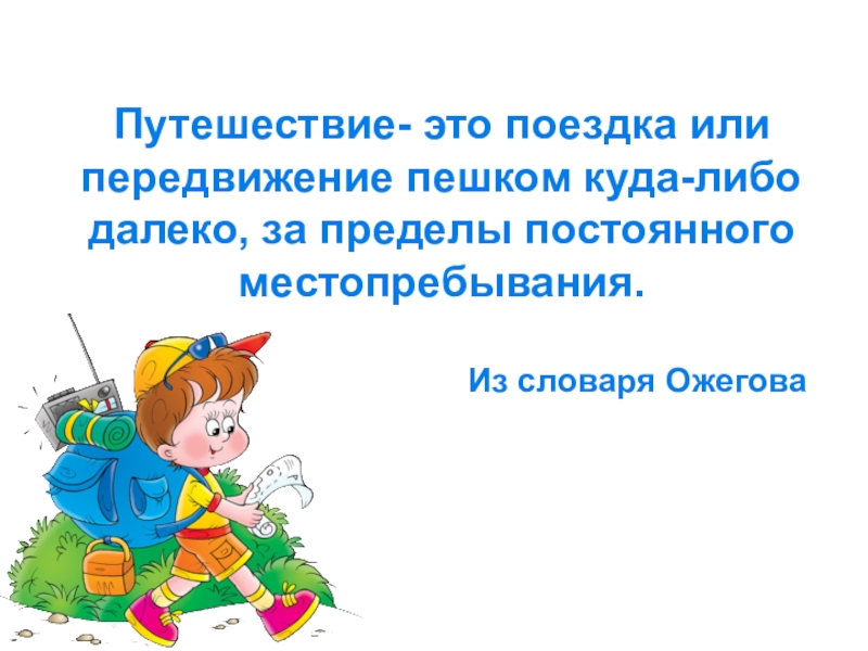 Слайд 4 Путешествие- это поездка или передвижение пешком куда-либо далеко, за пределы постоянного