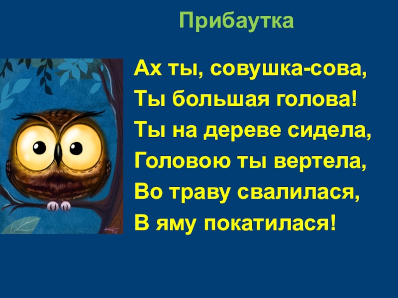 ПрибауткаАх ты, совушка-сова,Ты большая голова!Ты на дереве сидела,Головою ты вертела,Во траву свалилася,В яму покатилася!