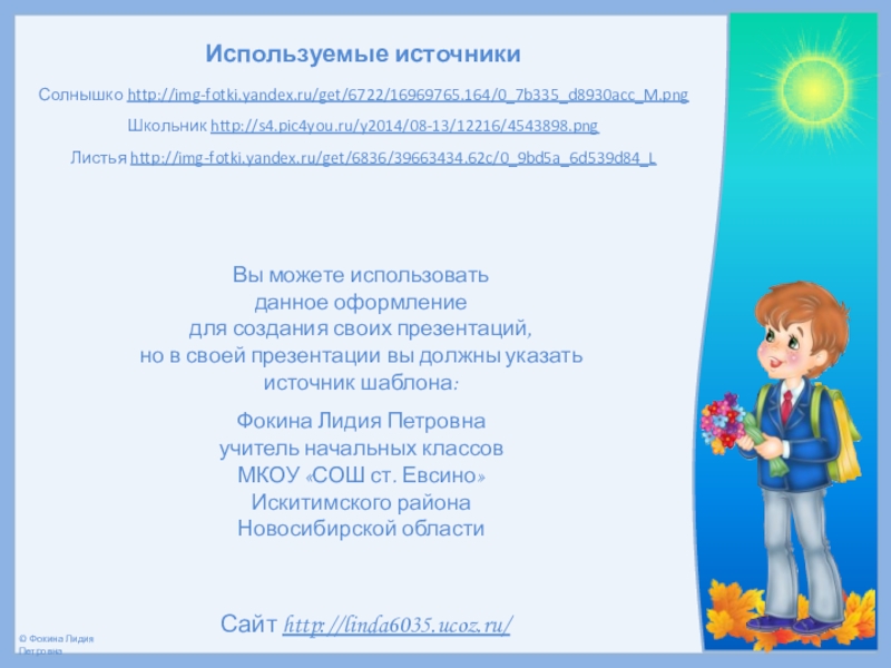 Используемые источникиСолнышко http://img-fotki.yandex.ru/get/6722/16969765.164/0_7b335_d8930acc_M.pngШкольник http://s4.pic4you.ru/y2014/08-13/12216/4543898.png Листья http://img-fotki.yandex.ru/get/6836/39663434.62c/0_9bd5a_6d539d84_L