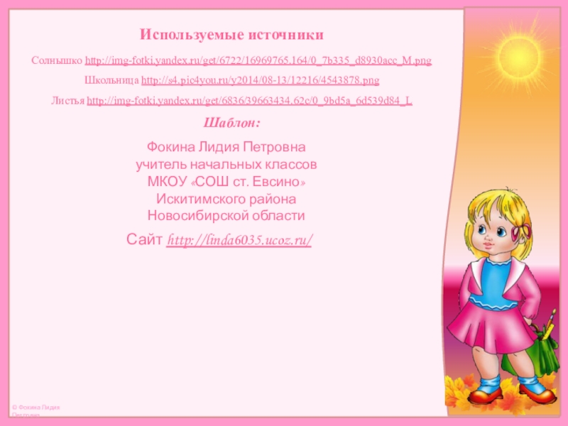 Используемые источникиСолнышко http://img-fotki.yandex.ru/get/6722/16969765.164/0_7b335_d8930acc_M.pngШкольница http://s4.pic4you.ru/y2014/08-13/12216/4543878.png Листья http://img-fotki.yandex.ru/get/6836/39663434.62c/0_9bd5a_6d539d84_L Шаблон: