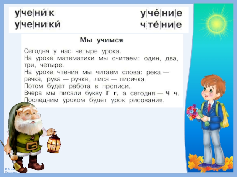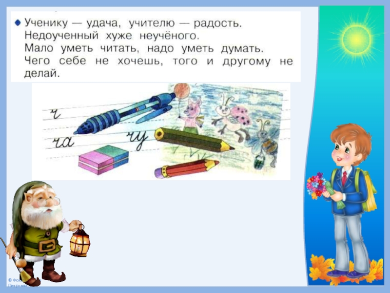 Используемые источникиСолнышко http://img-fotki.yandex.ru/get/6722/16969765.164/0_7b335_d8930acc_M.pngШкольник http://s4.pic4you.ru/y2014/08-13/12216/4543898.png Листья http://img-fotki.yandex.ru/get/6836/39663434.62c/0_9bd5a_6d539d84_L