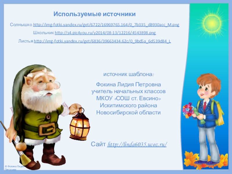 Используемые источникиСолнышко http://img-fotki.yandex.ru/get/6722/16969765.164/0_7b335_d8930acc_M.pngШкольник http://s4.pic4you.ru/y2014/08-13/12216/4543898.png Листья http://img-fotki.yandex.ru/get/6836/39663434.62c/0_9bd5a_6d539d84_L