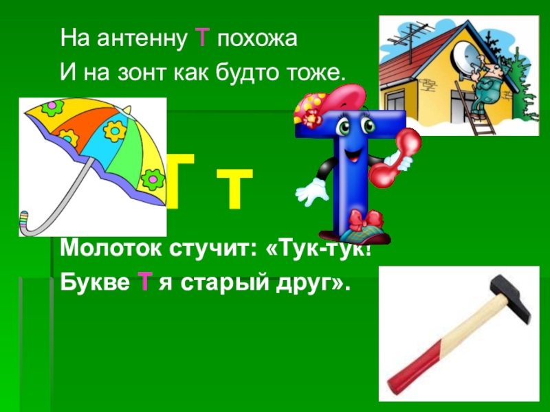 На антенну Т похожаИ на зонт как будто тоже.			 Т т Молоток стучит: «Тук-тук!Букве Т я старый