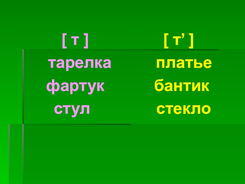 [ т ]   тарелка   фартук стул		   		[ т’ ]  платье