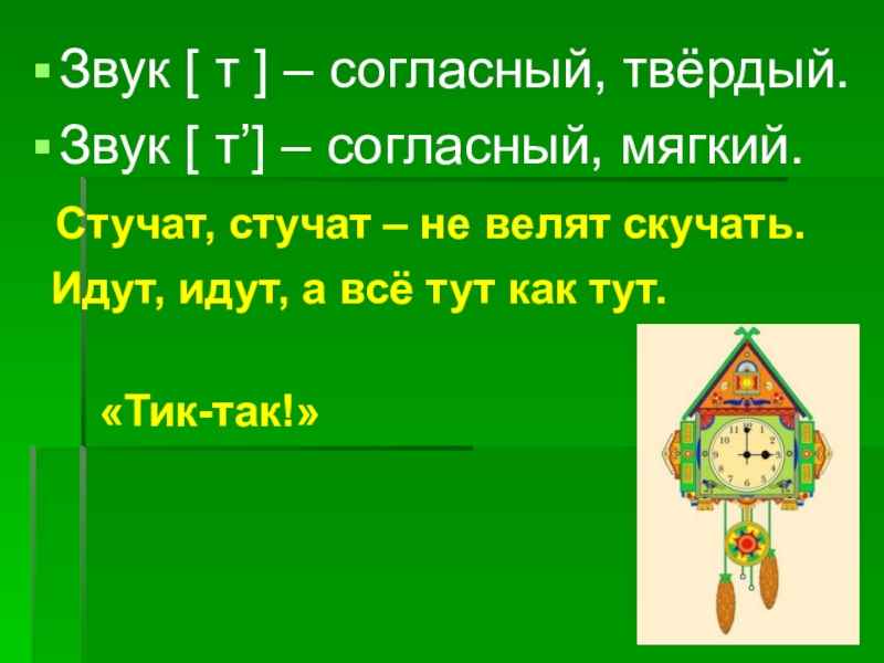 Звук [ т ] – согласный, твёрдый.Звук [ т’] – согласный, мягкий. Стучат, стучат – не велят