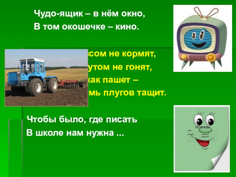 Чудо-ящик – в нём окно, В том окошечке – кино. Овсом не кормят, Кнутом не гонят, А как пашет – Семь плугов