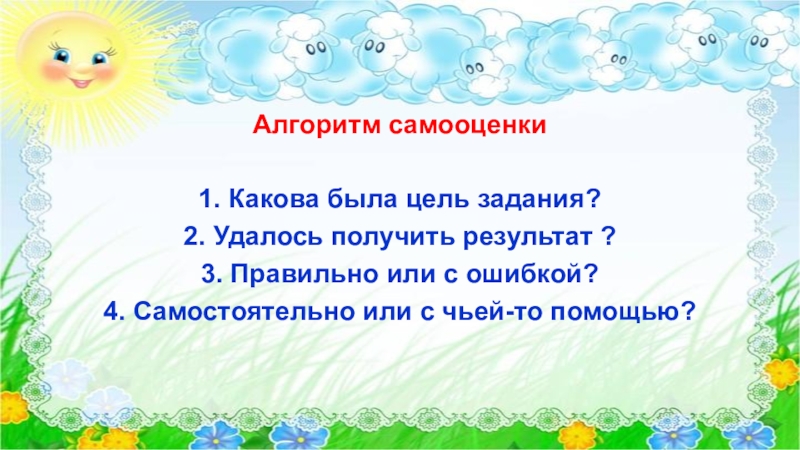 Алгоритм самооценки1. Какова была цель задания? 2. Удалось получить результат ? 3. Правильно или с ошибкой?4. Самостоятельно